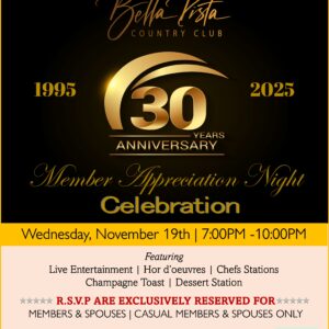 Special events for members at Bella Vista Country Club are regularly scheduled throughout the year, offering exclusive activities such as themed dinners, golf tournaments, and member appreciation days. Check our events calendar for details and upcoming dates.