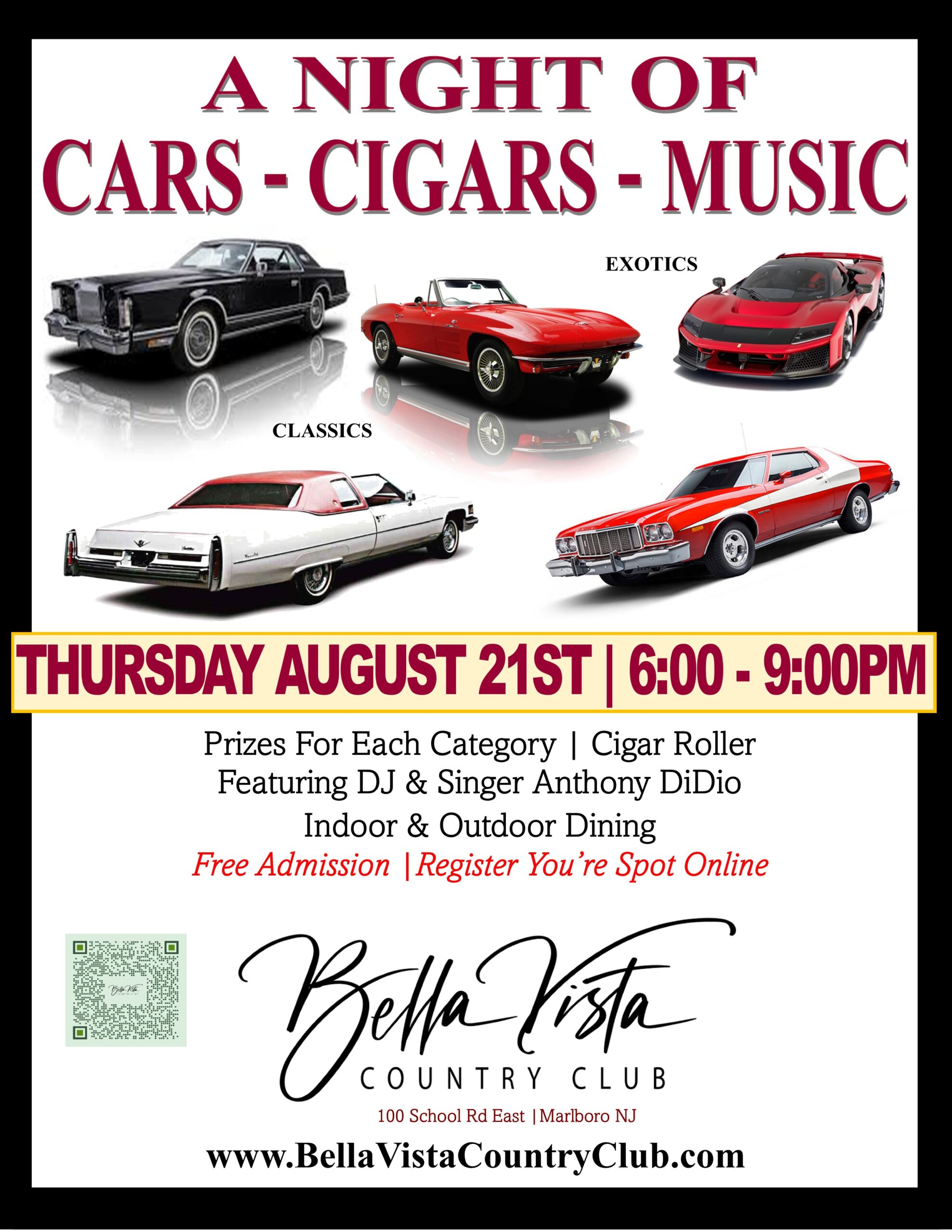 Bring your friends, show off your ride, and soak in a night of music, classic & exotic cars and smooth hand rolled cigars. Enjoy indoor & outdoor patio dining while listening to the fabulous music of Anthony Didio.